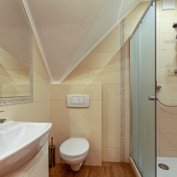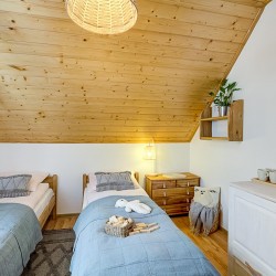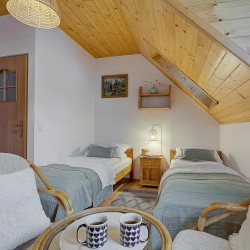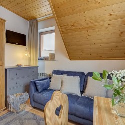 Dwa przestronne pokoje, przedpokój oraz łazienka. W jednym z pokoi znajdują się dwa łóżka pojedyncze, w drugim rozkładana sofa. Apartament posiada balkon i widok na góry.